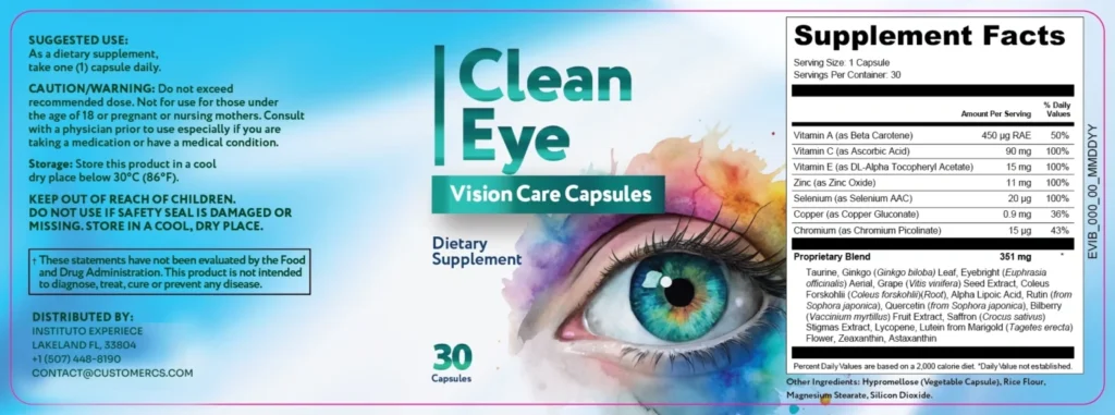 Clean Eye is a natural dietary supplement developed to support eye health and combat age-related vision decline. Its formula works from within, delivering key nutrients and antioxidants directly to eye tissues — helping to reduce oxidative stress, improve visual clarity, and protect the retina for long-term eye health.